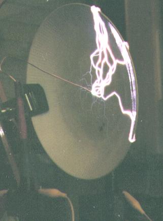 This was done with the 60kV pulses device. The porcelain plate is about 25cm in diameter, the electrodes from the two ignition coils touch it in about the middle on both sides. The discharges go along the plate surface round the edge. Photo: sensitive film (200 or 400 ASA), shutter open for about 10 sec (several discharges) plus flash to make the equipment visible. Room must be absolutely dark. |
