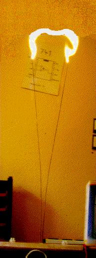 ![]() Jacob's ladder: two electrodes arranged in "V" shape. The arc is ignited at the point of smallest distance (bottom) and rises up till it reaches the end of the electrodes, gets too long and breaks off. Transformer: 4kV 2000VA mains. Photo: open shutter, ignite arc, wait till it has broken off, close shutter. Set the aperture to a high value (11 or 16). |