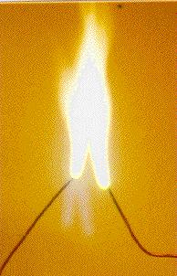 ![]() This is an arc produced with the 4kV 2000VA mains transformer . The electrodes are about 5cm apart. To ignite the arc, I brought a copper wire with long plastic handle between them; after the arc appeared, I pulled the wire away again. The arc has a upside-down-"V"-like shape, because the ionized air is extremely hot and therefore rises. If the electrodes were not bent upwards, the arc would not be stable because of this tendency to rise. Photo: nothing particular. The arc is bright enough to light the whole scene. |