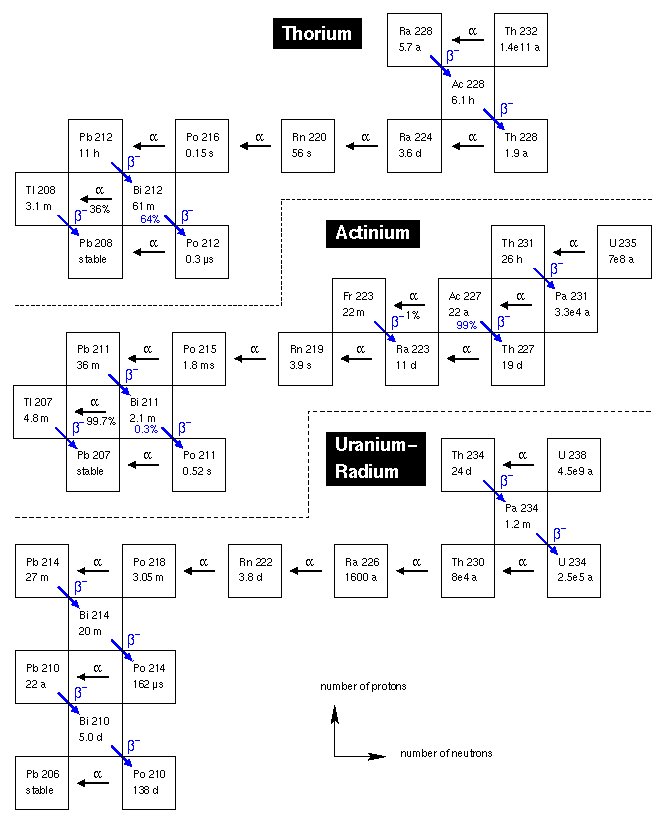 Decay chains and half-lives of the three natural radioactive families. Only branches with more than 0.1% probability are shown. Data taken from Karlsruher Nuklidkarte (December 1998).